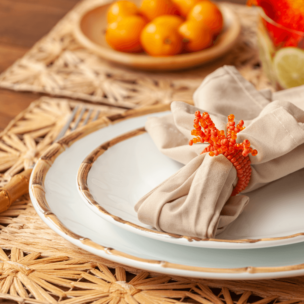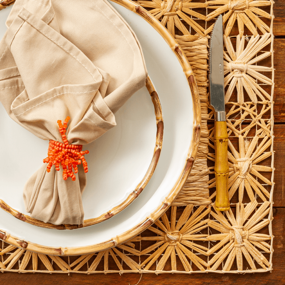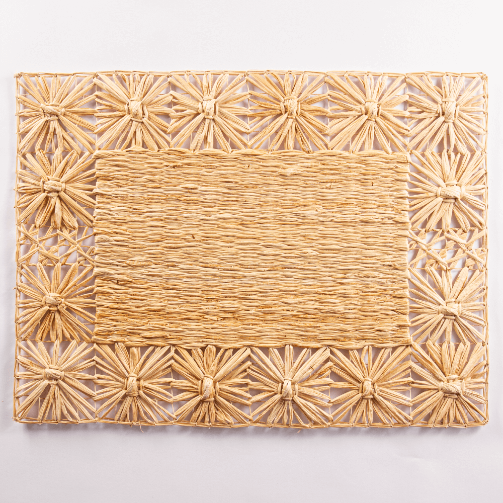 Banana fibres used to craft a clean weave in a charming rectangular flower placemat. Our beautifully handcrafted placemat brings natural warmth and appeal to modern organic dining tables, typically used for spring brunches and tropical outdoor dinner parties.