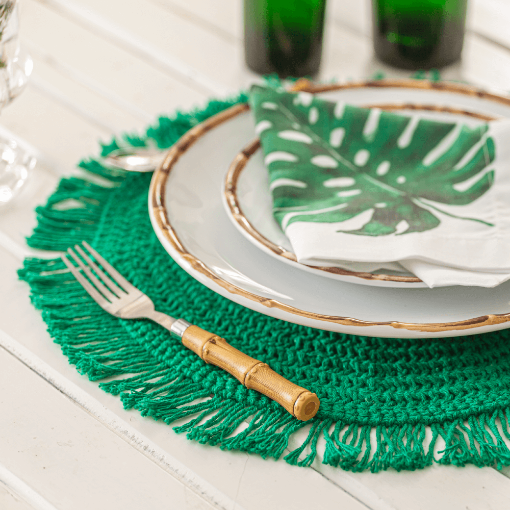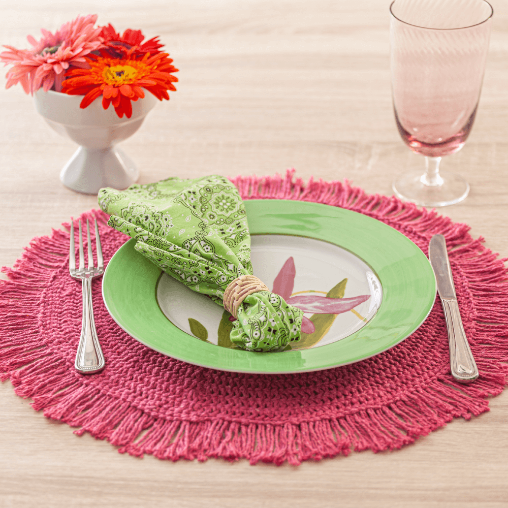 This round placemat with fringes provides you with a cosy table setting in no time. This can be perfectly combined with a matching tablecloth. Available in colours of light gray, light green, dark green, orange and pink.