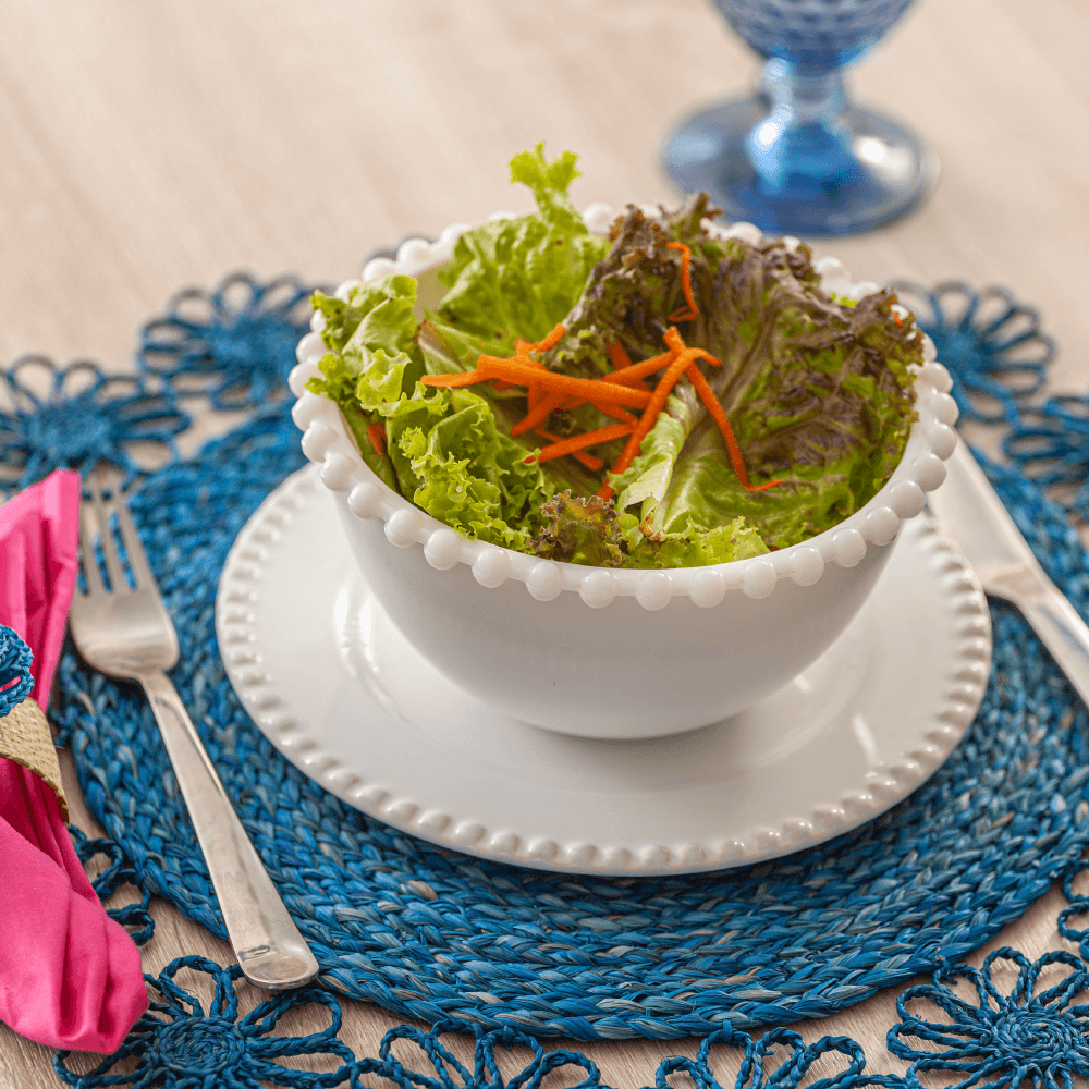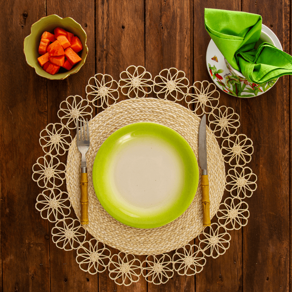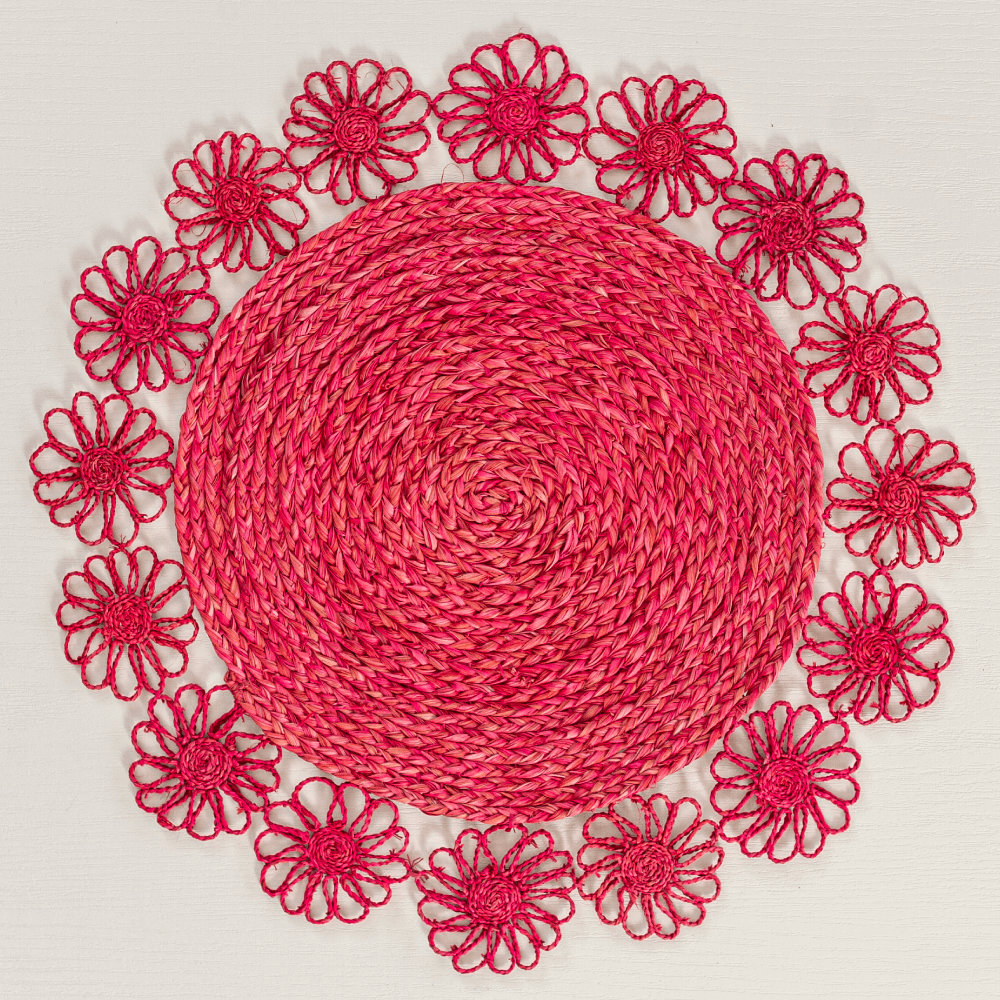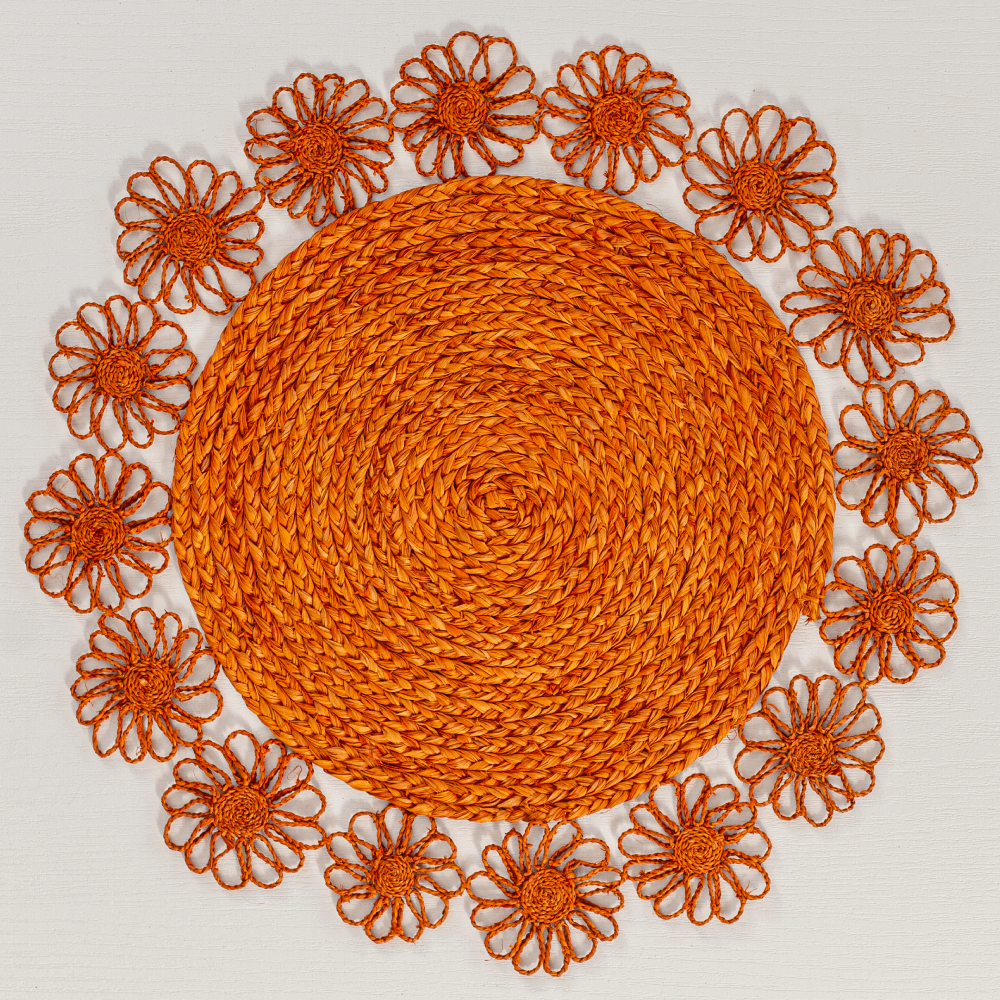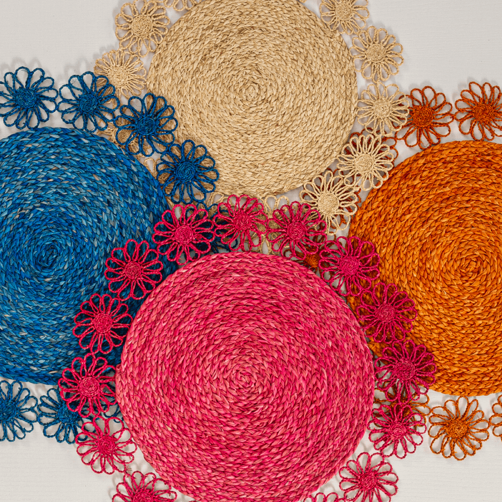 Blooming flowers flow across this stunning rustic round placemat. It is handmade from the buriti palm fibres. Its tropical silhouette pairs equally well with neutral or brightly coloured tableware and linens. Available in natural, blue, orange and pink tones.