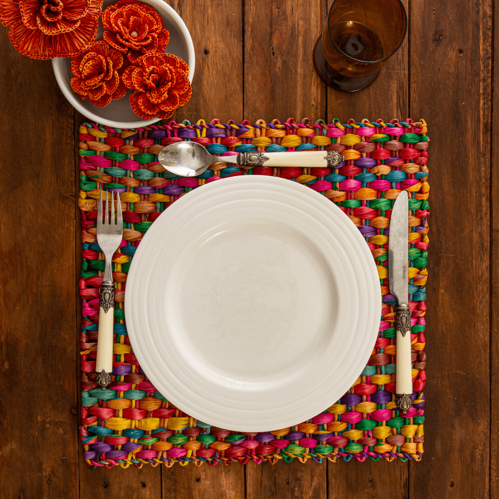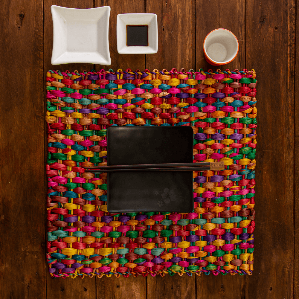 Handmade square placemat made from vegan dyed corn straw. This placemat is available in a colorful serene palette that’s a perfect addition to any table!